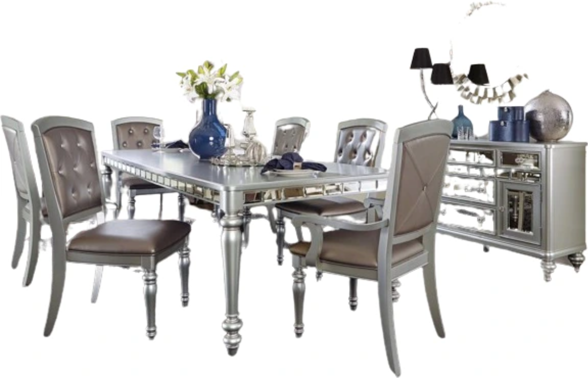 Reflet glamour de votre style personnel, la collection Orsina éblouira vos amis et votre famille lorsqu'ils entreront dans la salle à manger sophistiquée que vous avez créée. Une finition argentée étincelante met en valeur le tablier de la table et les façades de la desserte en miroir, tandis que le similicuir perle des chaises qui l'accompagnent offre un contraste élégant.Read More