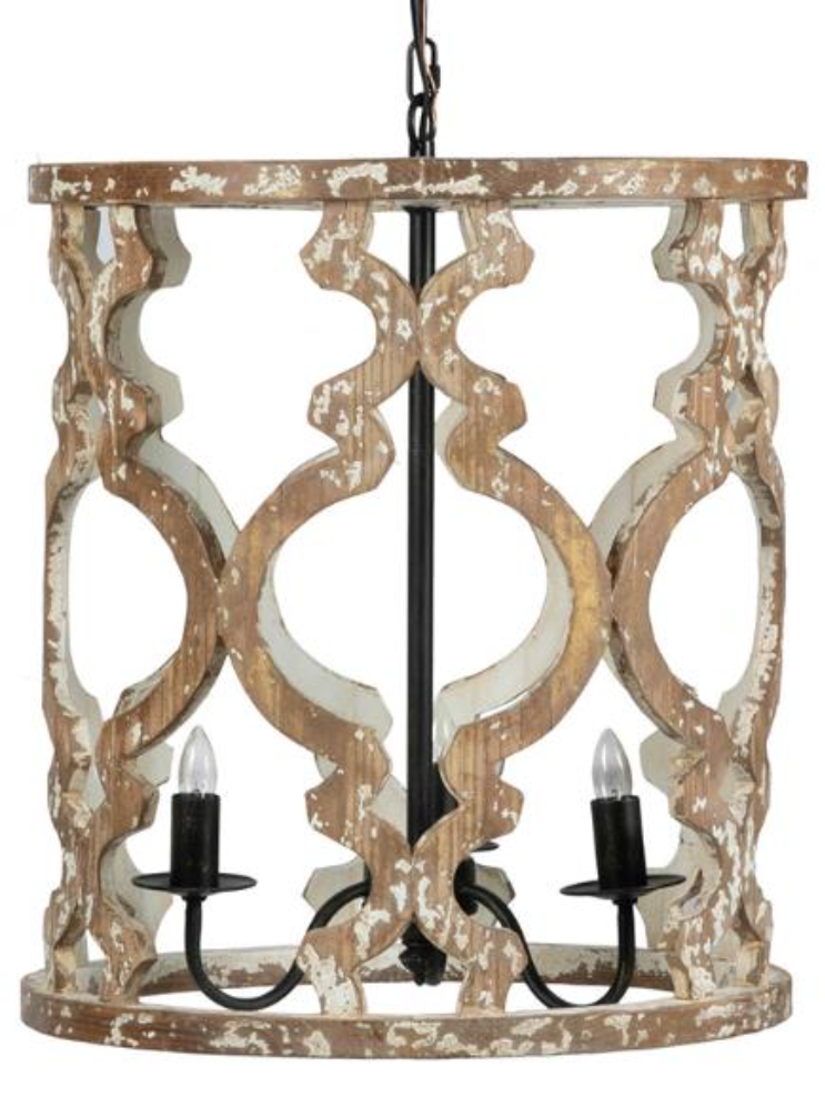 Blending a unique shape with a traditional pattern, this lavish chandelier adds a graceful, timeless look to any home. Constructed of wood with a whitewashed finish and accented by the black iron light fixture, this piece complements a variety of styles with its casual elegance.Read More