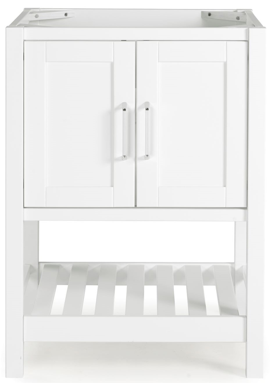 This freestanding vanity base cabinet has a classic look as well as ample storage space. The base features two paneled shaker doors with sleek nickel handles that allow you to store cleaning supplies and other bathroom essentials. An open, slatted bottom shelf offers additional room for bath towels or accessories. The clean white finish complements a wide range of decors.Read More
