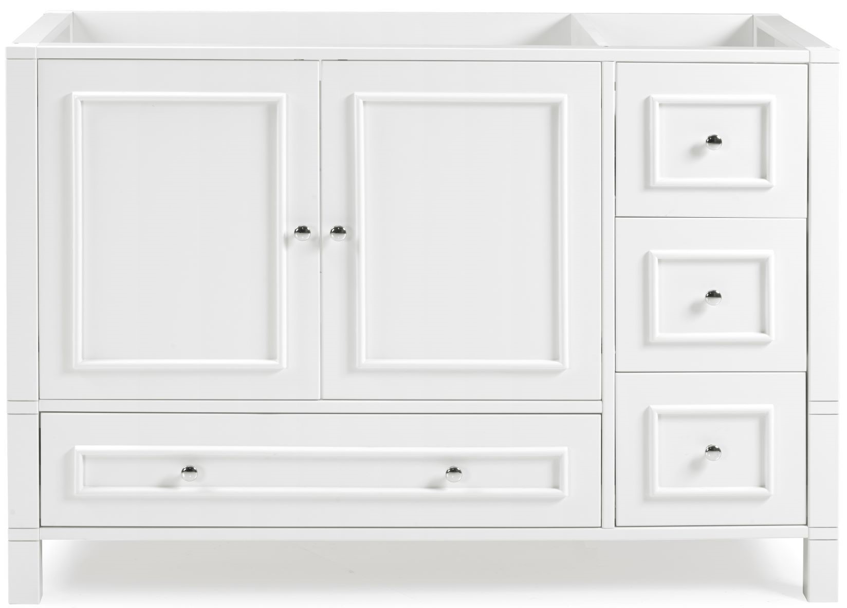 This vanity is sure to be the focal point in your bathroom. Strong lines and nickel hardware hardware blend seamlessly to elevate your everyday bathroom style with charm. The cabinet offers spacious storage for linens, toiletries, or other bath essentials, and soft-close doors drawers ensure discreet, quiet operation. Constructed of solid pine and composite wood with polished nickel hardware and a beautiful white finish that is designed to complement any decor.Read More
