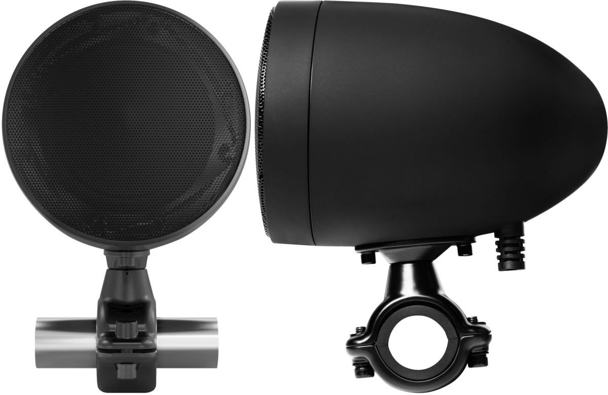 Pair of black 3" full range motorcycle speakers with built in amplifier and wired remote volume control.Read More