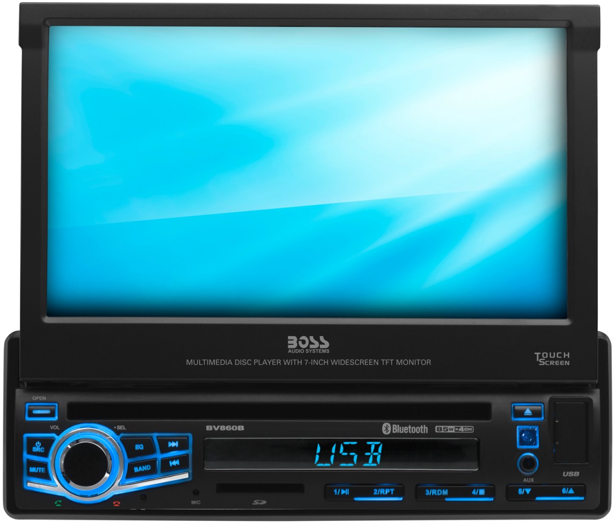 Single-DIN multimedia player featuring a DVD player, Bluetooth, AM/FM receiver and 7" motorized touchscreen.Read More