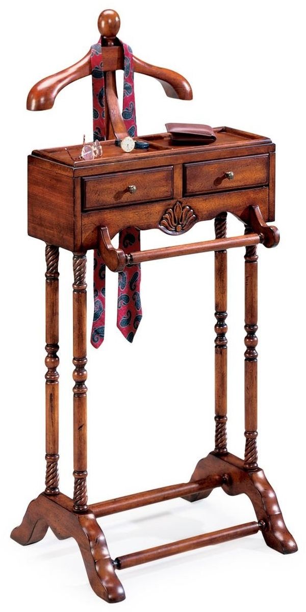 This elegant valet is a must for anyone with a flair for fashion. Hand crafted from solid hardwood, it features a scuptured wood hanger, ideal for a jacket, shirt or blouse; pants hanger, two drawers with antique brass finsihed hardware; and a top storage shelf.Read More