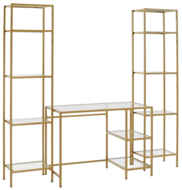 The Aimee 3-Piece Vanity Desk and Etagere Set is an eye-catching addition to any home office. With a sleek steel frame and tempered glass on the desktop and shelves, this home office desk set pairs with a variety of décor. Bring fashion and versatility to any room with this charming desk set.Read More