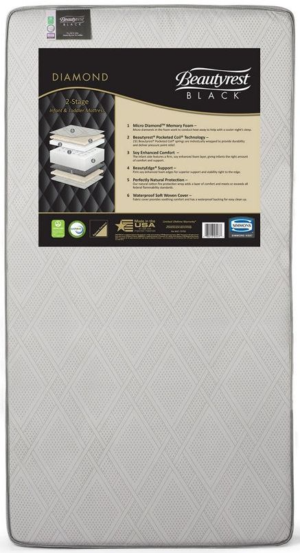 Create an unparalleled sleep experience for your little one with the Beautyrest® Black Beginnings Diamond 2 Stage Crib and Toddler Mattress. At the core of this baby mattress 231 Beautyrest® Pocketed Coil® springs provide firm and even support. These individually wrapped coils provide greater durability than traditional coils while delivering pressure relief for your growing baby. Built to keep up with your child’s changing sleep needs, this mattress is designed with two distinct sides, the infant side features a firm, soy enhanced foam layer for comfort and support while the toddler side has a layer of Micro Diamond™ Memory Foam which helps move heat away from the body for a cool, comfortable sleep.Read More