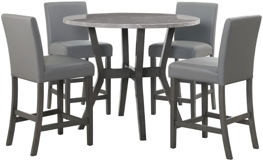 A beautiful counter dining set that brings a simple, elegant look to your dining area. It features a faux marble tabletop accenting its round shape that is perfect for smaller spaces. It comes with four smooth, upholstered counter chairs in a brushed grey PU fabric that will be a breeze to clean up.Read More