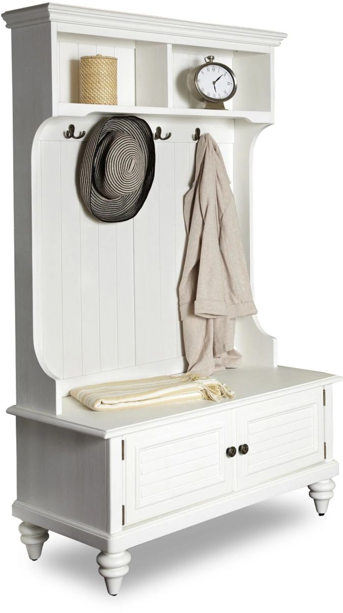 Inspired by the fusion of British traditional and old world tropical design, the Penelope Hall Tree by homestyles is constructed of solid hardwood and engineered woods in a refreshing, textured-brushed white finish. Further inspiration can be found in the shutter doors and turned feet.Read More