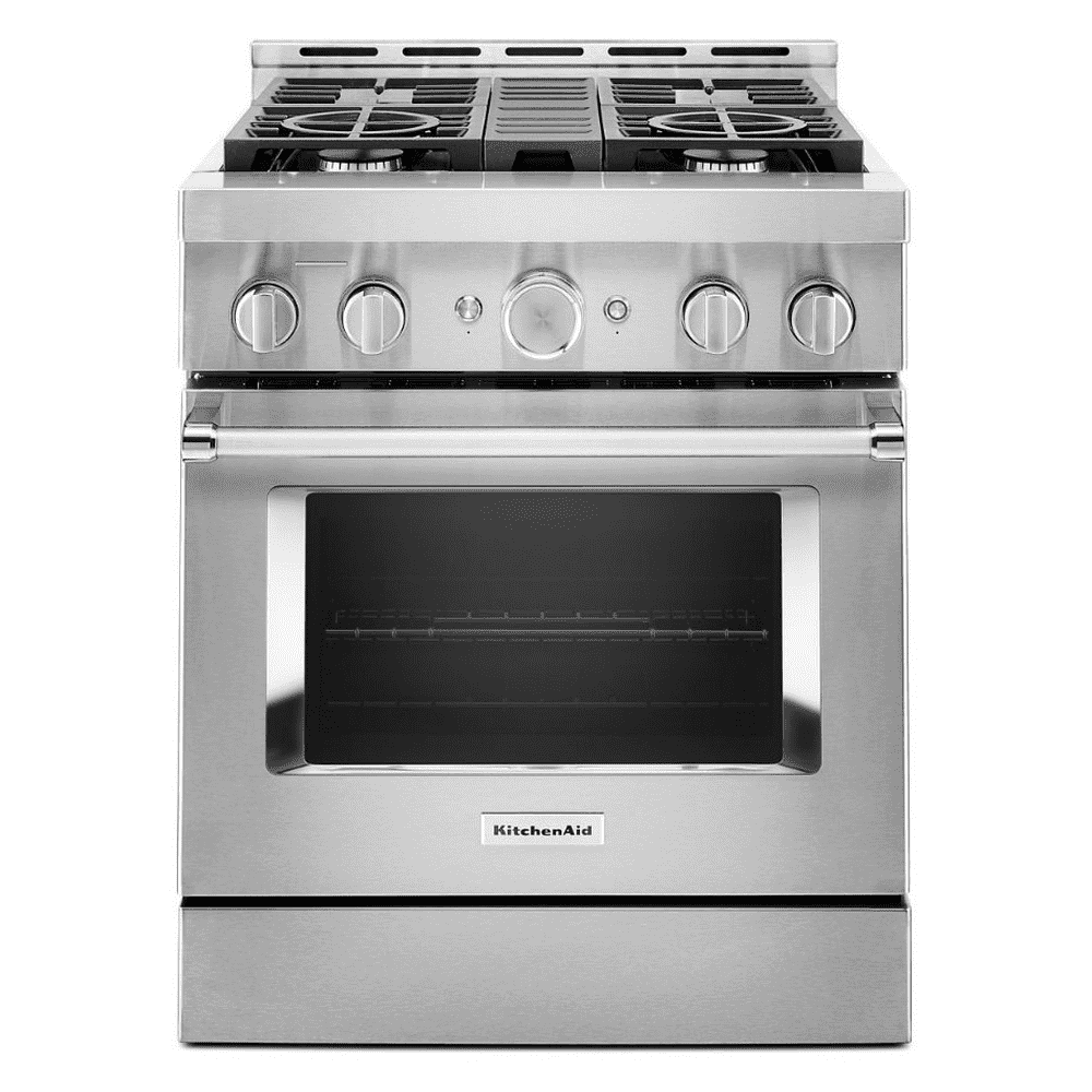 Empower your creativity with a 30-inch KitchenAid® Commercial Style Range with 4 burners. This gas range features two versatile 20,000 BTU Ultra Power™ Dual-Flame Burners with the power and precision needed to successfully sear, simmer, stir-fry and saute´. Even-Heat™ True Convection helps you achieve more consistent baking and roasting.Read More