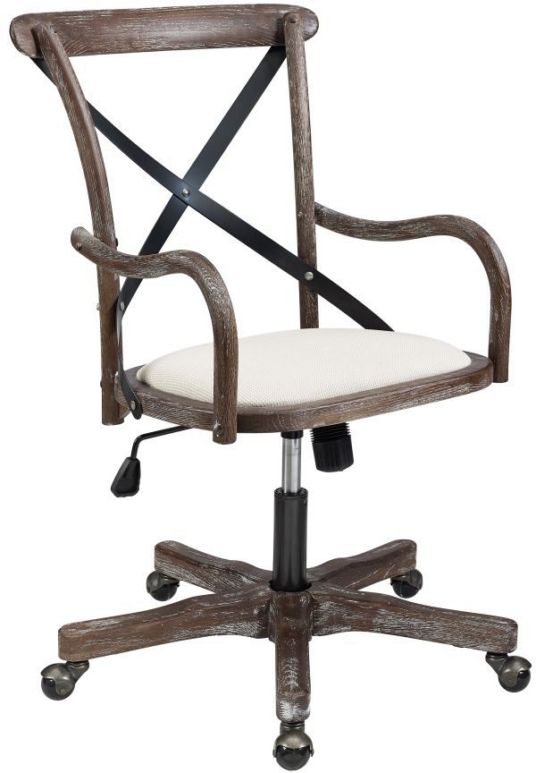Add stylish seating to your workspace with the Carson Cafe Office Chair. The gray washed wood finish is accented by the black metal X back accent and neutral fabric seat. Antique brass castors make for easy mobility around your office.Read More