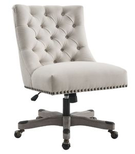 The Della office chair makes your work space stylish, while keeping you comfortable. The plush chair features a gray wash wood base with metal castors allowing you to easily move around your workspace. The chair is accented with a button tufted back, antique brass nailheads and smooth swooping sides.Read More
