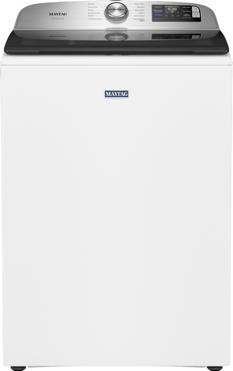 Get a clean you can see with the Maytag® pet pro washer that's built to trap and remove pet hair. Press the pet pro option to activate the built-in pet pro filter to visibly remove pet hair. Extra power boosts stain fighting on any wash cycle so you can walk away while stains wash away. The deep fill option delivers more water when you want it with your choice of deeper water levels, while the built-in water faucet delivers a quick rinse or a long soak leaving clothes ready for the wash cycle. Plus, smart washer features help you stay in control and efficiently manage laundry from anywhere. Maytag™ app to remotely start or stop your appliance and get end of cycle notifications.Read More