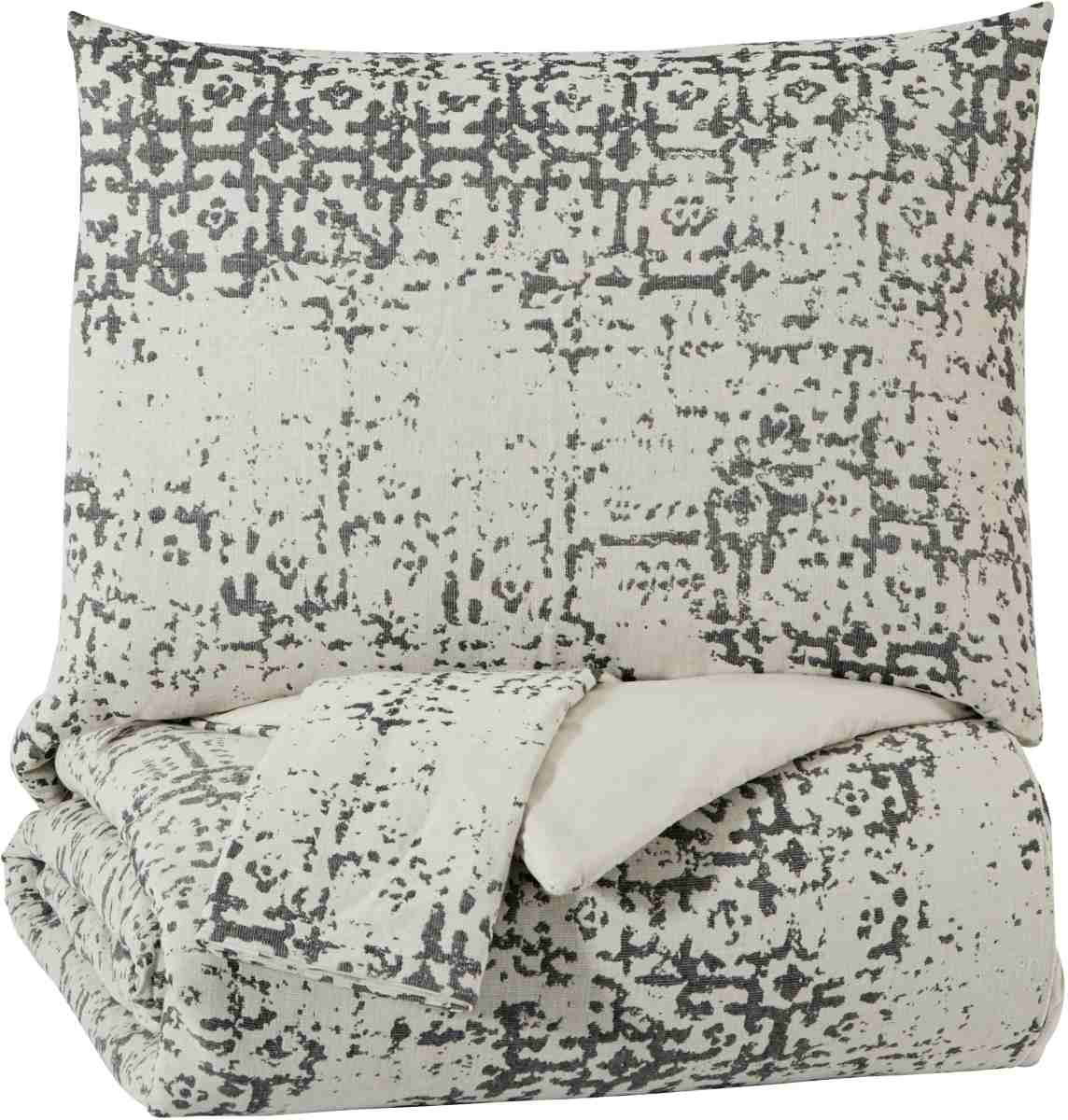 3-Piece comforter set - includes comforter and 2 shams. Yarn dyed jacquard woven distressed geometric design in charcoal and bone. Cotton cover with polyester filling. Machine washable.Read More