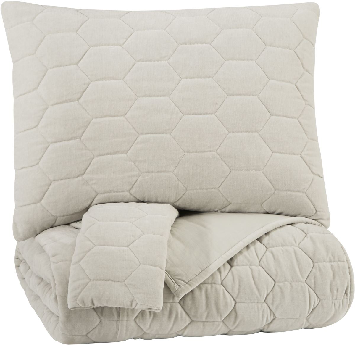 3-Piece coverlet set - includes coverlet and 2 shams. Dry cotton velvet solid in bone with stitched honey comb design. Cotton cover with polyester filling. Dry clean only.Read More