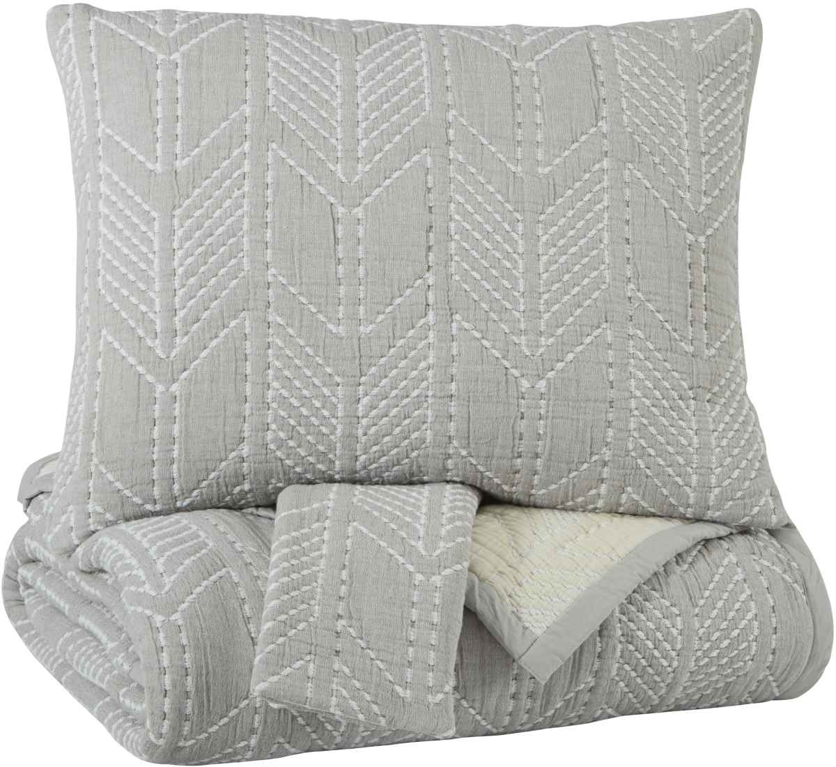 3-Piece coverlet set - includes coverlet and 2 shams. Pick stitched arrow design in gray and white. Reverses to arrow design in cream and white. Cotton cover with cotton filling. Machine washable.Read More