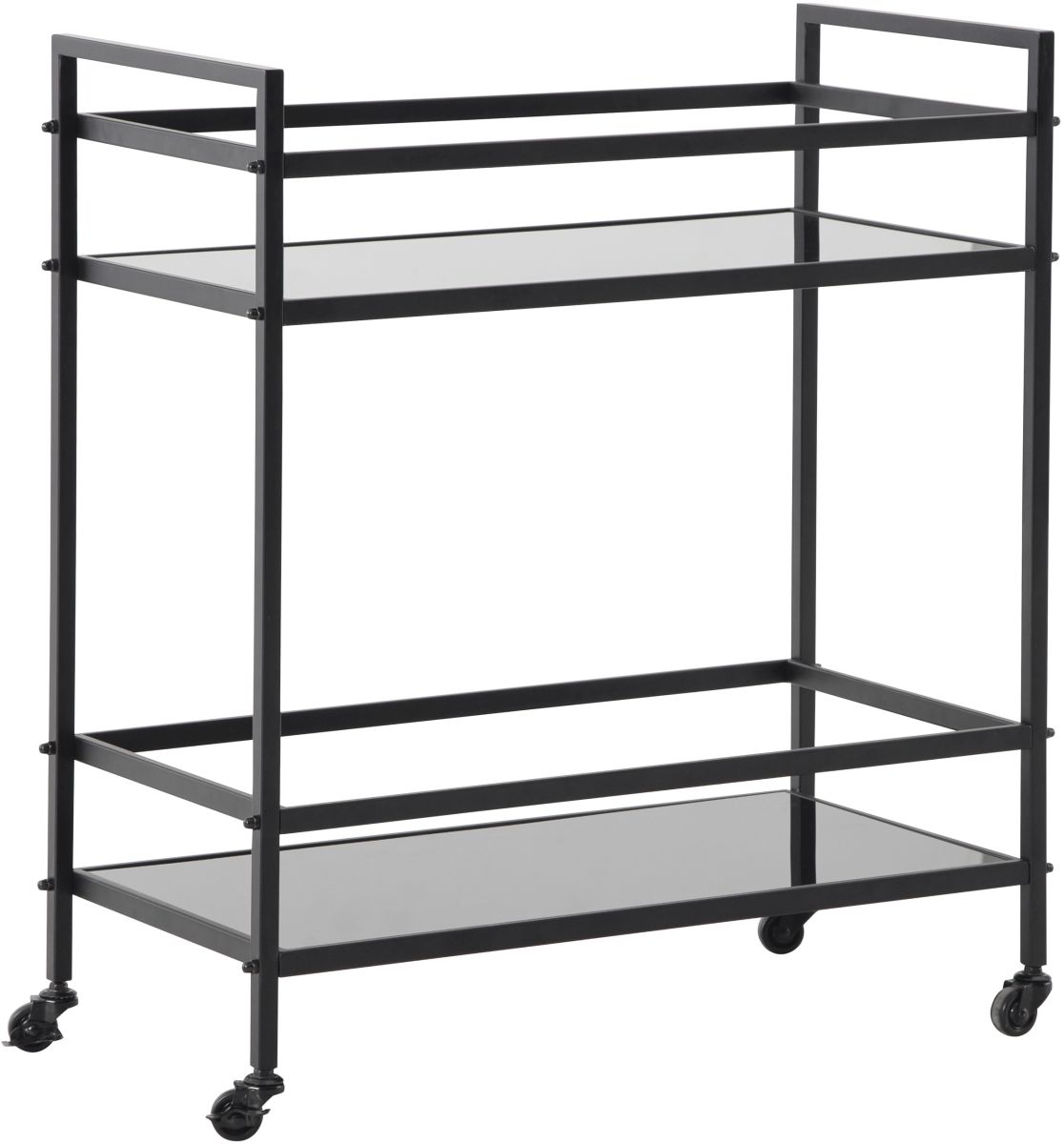 Impress your party guests in style with this bar cart. Constructed of metal in black finish and black finished glass keeps the two tray shelves look sleek. Smooth-gliding and locking casters offer easy mobility and security for your items in the cart.Read More