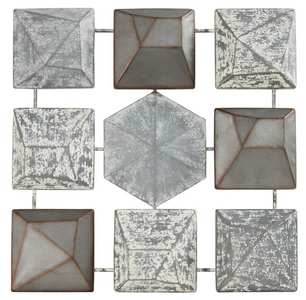 Add dimension to your wall with the INK+IVY Essex Metal Wall Décor. Muted tones of blue and grey come together with sharp geometry to create this striking metal wall art piece. The iron tinplating finish gives the piece its galvanized appeal that pairs well with any industrial décor. Easy to hang, this metal wall décor is sure to please.Read More