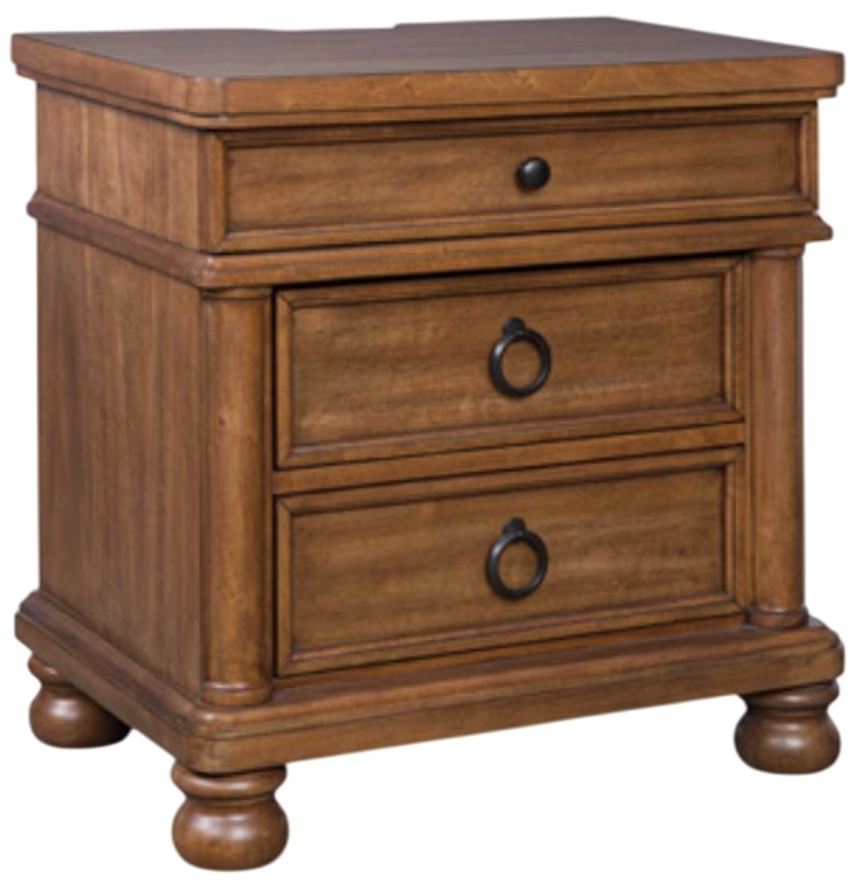 The Signature Design by Ashley® Rowlenstown Brown 3-Drawer Nightstand offers stylish storage with three smooth-gliding drawers. Finished in a warm brown tone, it features a built-in 110V power supply with dual USB-A and USB-C charging ports, blending classic design with modern convenience for a well-equipped, organized bedside space.Read More